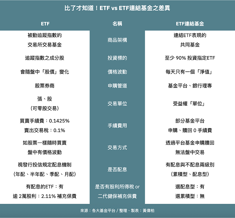 相較於ETF的投資普及,一般投資人、散戶或許對ETF連結基金可能較不熟悉。ETF連結基金,是一種成分標的為ETF的基金形式,並確保盡可能與ETF保持一致的投資成果。ETF連結基金和ETF之主要差異包含:商品的架構、交易方式,及申購贖回的管道等。
