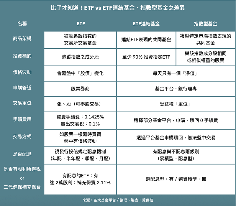 而ETF連結基金,則是一種成分「標的為ETF」的基金架構,確保盡可能與ETF績效保持一致的投資成果。雖然其與指數型基金都是人為操盤的基金,兩者成份標的仍有些不同;至於前兩者商品與ETF的不同,主要則在於交易方式、及購買管道。