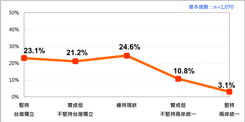 游盈隆分析,如果看更仔細一點,在四成四期盼未來台灣獨立的人中,有52.1%很堅持未來台灣獨立,47.9%贊成但不很堅持;同時,期盼未來兩岸統一的人當中,22.1%很堅持未來兩岸統一,77.9%贊成但不很堅持。由此,可以發現,在今日台灣,23.1%很堅持未來台灣獨立,21.2%贊成但不堅持未來台灣獨立,兩成五期盼未來仍維持現狀,10.8%贊成但不堅持兩岸統一,3.1%很堅持未來兩岸統一。這才是台灣人今日的統獨傾向;3.1%強烈主張未來兩岸統一,23.1%強烈主張未來台灣獨立。
