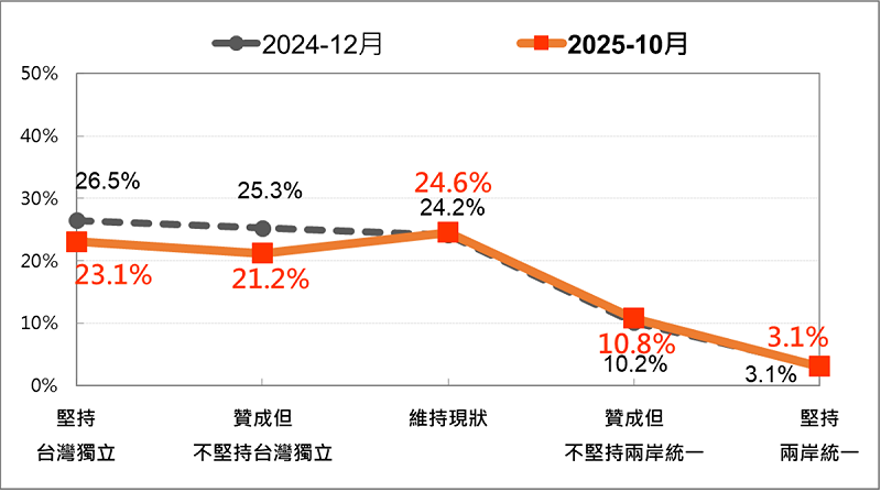 此外,這次民調和最近一次調查(2024年12月)相比,期盼「未來台灣獨立的人」大幅下滑7.5個百分點,期盼「未來繼續維持現狀的人」略增 0.4個百分點,期盼「未來兩岸統一的人」略增 0.6 個百分點。整體來講,兩次調查相隔10個月,現狀派和統派只有微小變化,但獨派罕見大幅滑落7.5個百分點,是一個不尋常的、驚人的現象。