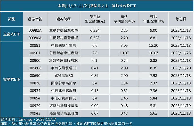 以 11 月來看,將在下半旬迎來台股ETF除息潮,共計 30 檔產品先後除息,當中又尤以本周二(18 日)為超級除息日,共有 18 檔ETF集中於這天除息。