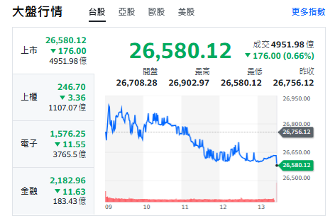 台股今天(19日)開低走低,終場收跌逾百點,跌破27000,收在26580點。分析師林漢偉表示,全球股市拋售模式啟動,外資順勢壓低結算,指數收盤再創波段新低,現在離季線只剩下200點,多頭命懸一線,市場關注最後希望只能擁抱輝達!