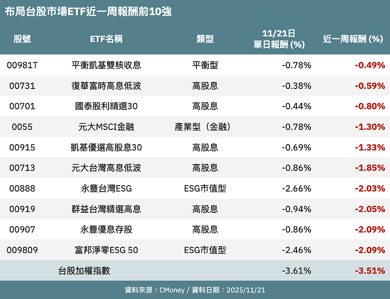 市場人士觀察,從近一周最抗跌的是平衡凱基雙核收息(00981T),可看出在加權指數短線遭遇修正之際,配備 7 成債券部位的ETF,確實發揮平衡波動的效果。近期市場對 AI 估值過高產生疑慮,今年來領漲的科技族群,也在這波評價修正中領跌;而債券的穩定性可抵銷股票波動、並提供固定收益,讓整體投資在風險與報酬間取得最佳平衡。