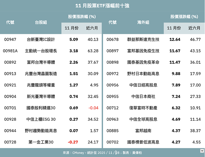 能繳出正報酬的 ETF 橫跨主動式、高息、IC設計與半導體等不同族群,顯示市場氛圍偏保守,而中長期成長性看好的產業,或具防禦特性的主題受資金青睞。其中,台新臺灣IC設計(00947)為 11 月「黑馬」,其主打 IC 設計題材,受惠記憶體與聯發科(2454)、「股王」信驊(5274)等類股強漲,單月繳出 5.09% 漲幅居冠。時間拉長至近六個月來看,績效飆漲 40.13%。
