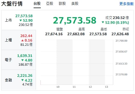 台股今天(1日)開黑小跌52點,最低來到27573點,上櫃小漲,電子與金融類股走跌。聚焦重要電子權值股,約9點10分前,台積電跌5元、來到1435元。鴻海跌1元、來到224.5元。廣達漲3.5元、來到285,5元。聯發科漲10元、來到1405元。台達電漲10元、來到942元。