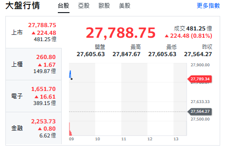 台股今天(3日)開紅衝漲224點,最高來到27847點,上櫃、電子與金融類股全揚升。重要電子權值股,約9點15分前,台積電漲15元、來到1445元。鴻海漲6元、來到228元。廣達漲1.5元、來到290元。聯發科漲5元、來到1420元。