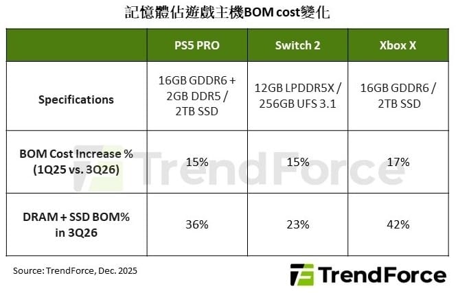 TrendForce指出,記憶體價格飆升衝擊諸多終端消費設備,遊戲主機此波亦難獨善其身。事實上,遊戲主機因其獲利主要來自軟體與會員服務,且意在擴大用戶基礎,過往多以產品售價逐步下調或定期促銷為銷售策略。