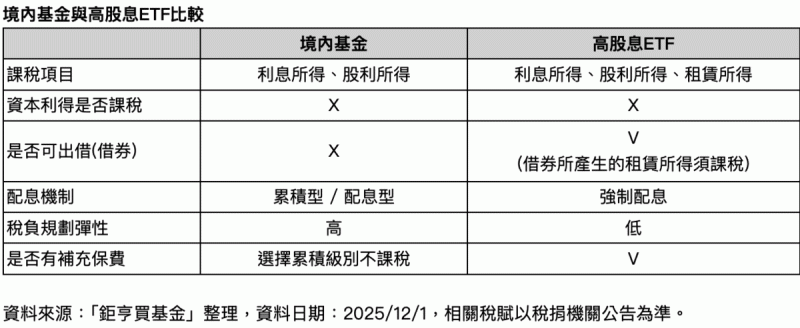 陳俊廷指出,高股息屬於「強制配息型」商品,投資人無法自行選擇。這意味著,未來若政府推動二代健保「全年累積制」,拆單策略也將難以運作;相較下,境內共同基金雖在課稅流程上類似ETF,但具備兩項重要優勢:首先,基金沒有借券行為,因此沒有租賃所得的稅負問題;其次,基金可選擇「累積型級別」,不配息、專注於資產滾存,對並非立即需要現金流的族群更具效益。利用基金淨值的成長累積資本利得,可避開配息需課稅的缺點,也能透過複利效應提升長期報酬。