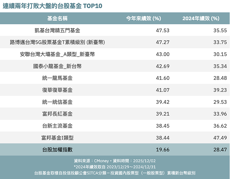 在這之中,今年來表現前十名的台股基金,分別繳出 38%~47% 不等的含息報酬率,而前五強「凱基台灣精五門基金」、「路博邁台灣 5G 股票基金T累積級別(新臺幣)」、「安聯台灣大壩基金_A類型_新臺幣」、「國泰小龍基金_新台幣」、「統一龍馬基金」、「復華復華基金」更是無畏今年四月遭遇對等關稅亂流,逆勢衝出逾 40% 績效,亮眼表現難以忽視。