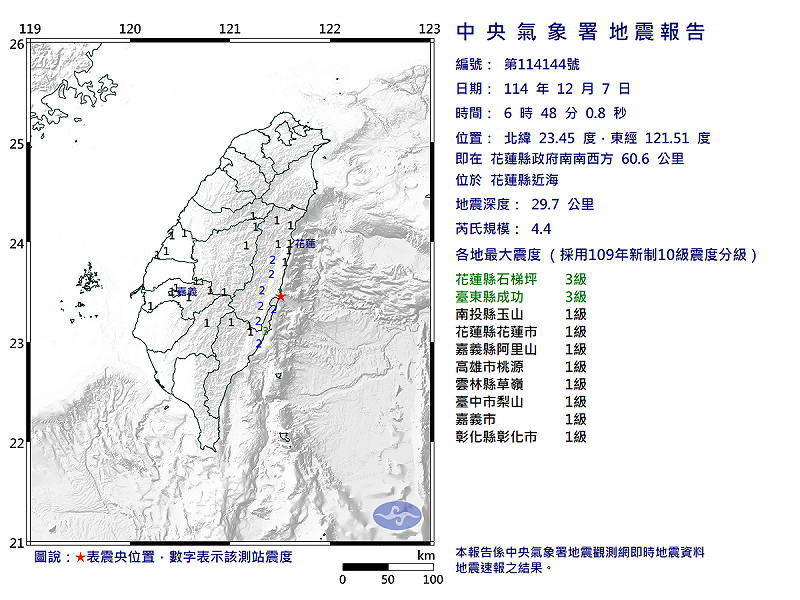 根據中央氣象署資料,12/07-06:48發生芮氏規模4.4有感地震 ,震央位於北緯 23.45度、東經121.51度,地震深度為29.7公里 ,相對位置在花蓮縣政府南南西方 60.6 公里 (位於花蓮縣近海)。各地最大地震度級: