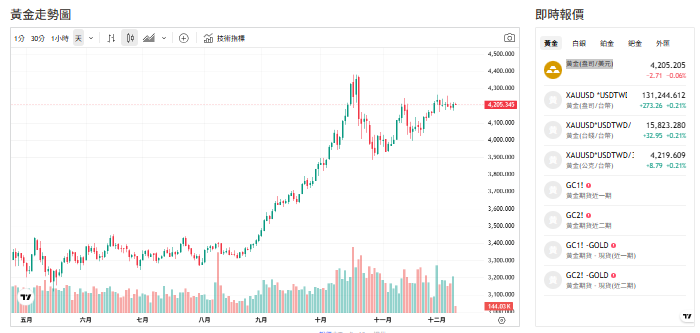 近期市場雖預期12月 FOMC 會議將降息一碼,但同時也認為會後聲明及主席鮑威爾的談話可能釋出較為強硬或謹慎的訊號,重申仍需觀察經濟數據,並提高未來進 一步降息的門檻,使美債殖利率反彈,進一步壓抑金價走勢,使金價一度下挫至4170美元附近。截至今天(10日)下午1點,黃金交易價來到4207(盎司/美元)。