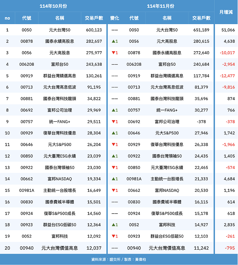 依這項排行,11 月定期定額交易戶數前五名分別為:元大台灣50(0050)、國泰永續高股息(00878)、元大高股息(0056)、富邦台50(006208)、群益台灣精選高息(00919)。然而,在前五名中,僅 0050、0056 的定期定額呈現「月增」,其中 0050 單月大增 5.1 萬最多。
