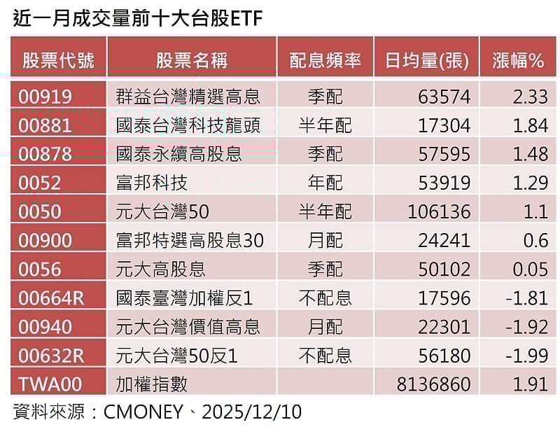 在近期大盤高檔震盪之際,統計近一個月日成交均量前 10 檔被動式台股ETF中,包括群益台灣精選高息(00919)、國泰永續高股息(00878)、富邦特選高股息30(00900)、元大高股息(0056)、元大台灣價值高息(00940)共有 5 檔是高息型。