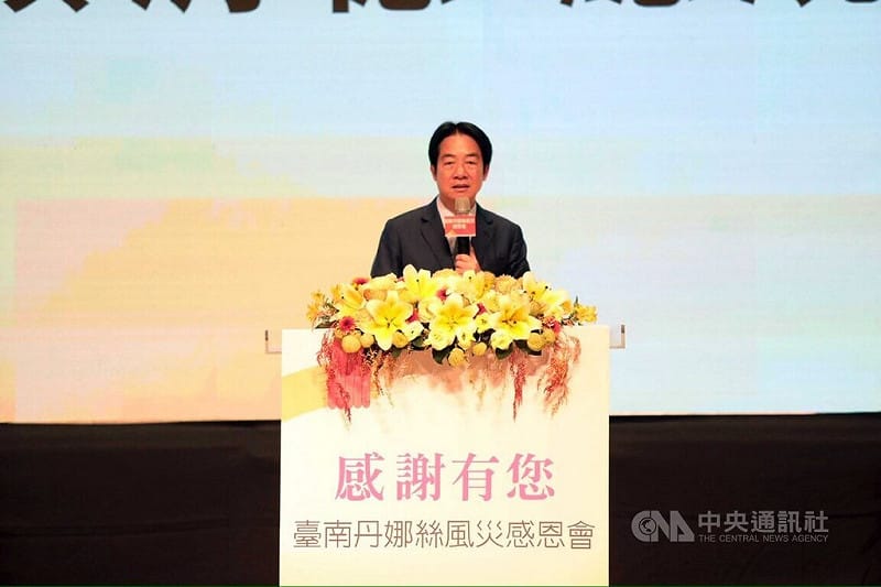 台南市政府下午在新營文化中心演藝廳舉辦台南丹娜絲風災感恩會,感謝協助救災的公部門及民間企業、公民團體等單位,賴總統親臨現場向所有救災有功人員致謝。