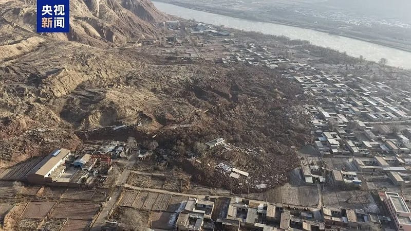中國甘肅省發生山體滑坡,造成 45 戶住宅遭土石掩埋。 圖:翻攝自 央視新聞