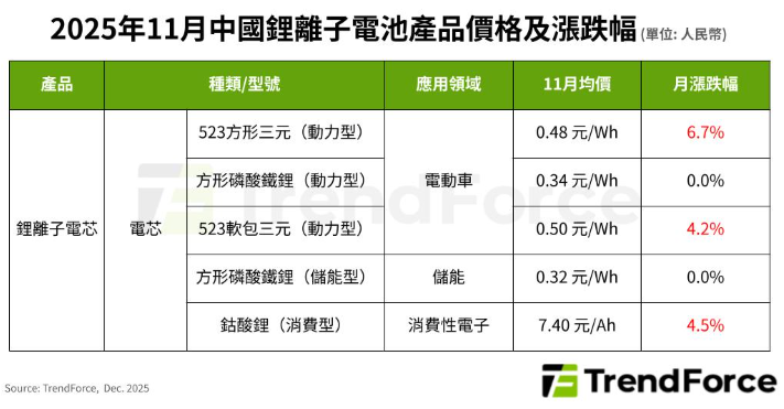 根據TrendForce最新「鋰電池產業鏈價格月報」,2025年十一月動力電池市場延續「產銷兩旺」局面,儘管進入消費淡季,但車廠搶裝電池支撐需求,加上近期正極材料、電解液、銅鋁箔等價格走揚,動力電池材料成本顯著上升,促使動力電芯價格止跌反彈,尤以含鈷元素的三元電芯價格漲幅最大。
