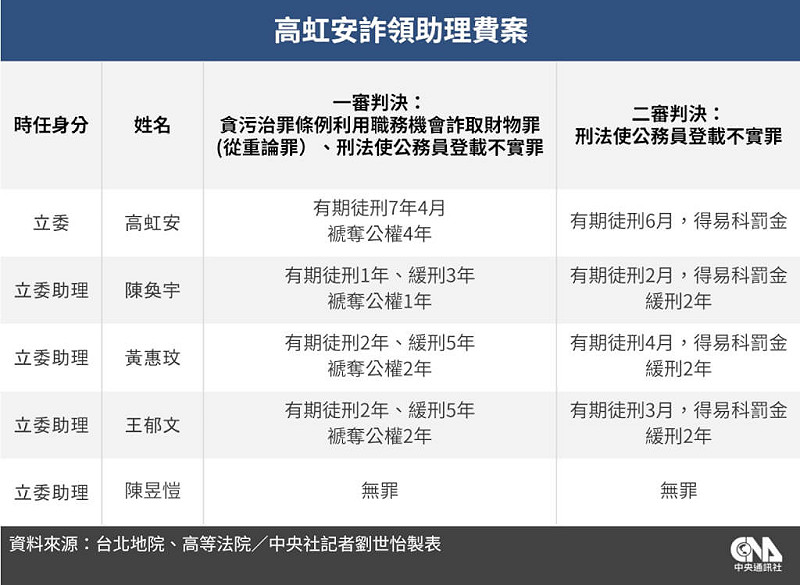 全案起於,高虹安被控擔任立法委員期間,浮報助理酬金及加班費,一審認定高虹安與3名助理(陳奐宇、黃惠玟、王郁文)罪證明確,構成貪污治罪條例利用職務機會詐取財物罪、使公務員登載不實罪,從重依貪污罪判高虹安7年4月徒刑、3名助理有罪獲緩刑;全案經上訴,二審由台灣高等法院審理,今天認定不構成貪污罪,僅依使公務員登載不實偽造文書罪論罪。