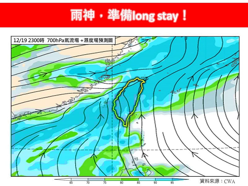 19、20日東北季風減弱,南方雲系接替北抬,南部、東部及東南部有局部短暫陣雨,其它地區亦有零星短暫雨機會;由於環境相當不穩定,水氣偏多,導致各地降雨機會都有提高的趨勢;21日東北季風再增強,迎風面的桃園以北、東北部、東部地區及恆春半島都轉為有局部短暫雨天氣,東南部地區也有零星短暫雨,其它地區仍然維持為多雲到晴,雨勢大概到22日後,才會逐漸減緩。