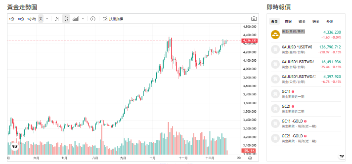 市場受到美國前日公布失業率數據高於預期影響,資金持續流入金市,加上美國總統川普已下令全面封鎖所有進出委內瑞拉的受制裁油輪,避險情緒升溫,激勵金價上漲來到4,342 美元後,回跌至 4,315 美元附近波動。截至今天(18日)黃金交易價來到4333(盎司/美元)。