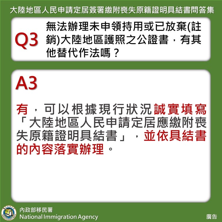 換言之,內政部要依親居留或定居,都得新增「申請放棄大陸地區護照」。而內政部在辦法修訂後問答圖版說明表示,「無法辦理未申領持用或已放棄(註銷)大陸地區護照之公證書,有其他替代作法嗎?」「有,可以根據現行狀況誠實填寫「大陸地區人民申請定居應繳附喪失原籍證明具結書」,並依具結書的內容落實辦理」。