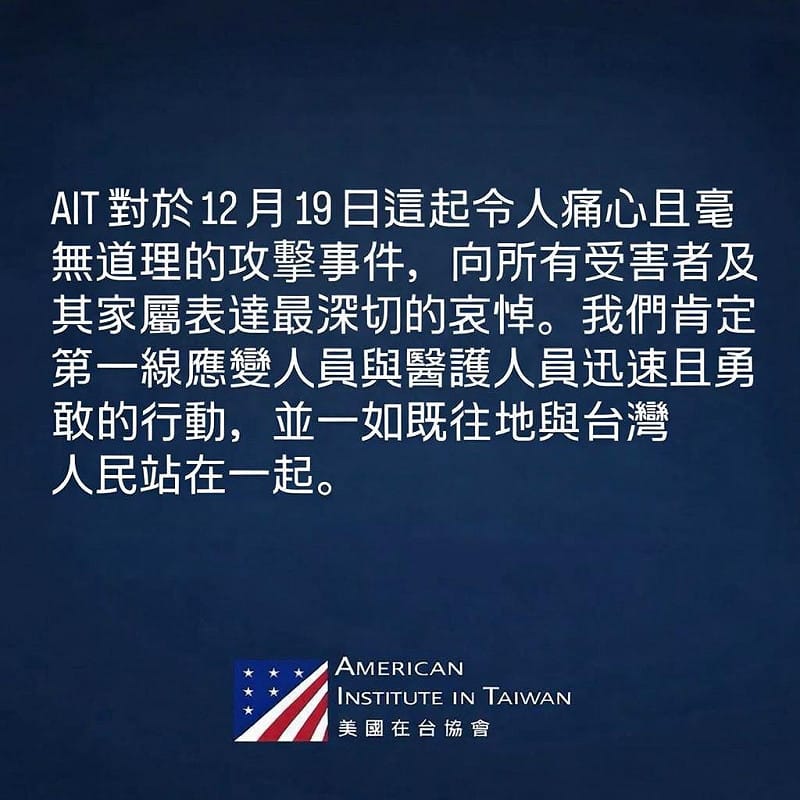 針對此案, AIT 今日表示,對於昨日這起令人痛心且毫無道理的攻擊事件,向所有受害者及其家屬表達最深切的哀悼。 AIT 高度肯定第一線應變人員與醫護人員迅速且勇敢的行動,並一如既往地與台灣人民站在一起。
