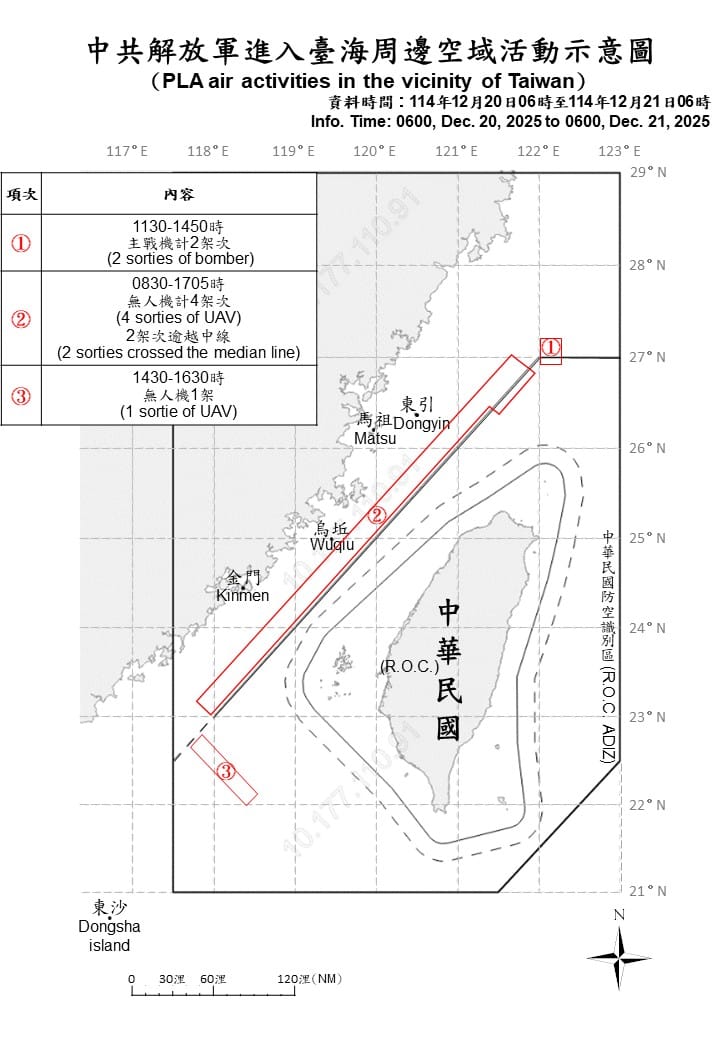 國防部今(21)日公布最新台海周邊海、空域動態指出,自12月20日清晨6時起,至12月21日清晨6時止,國軍偵獲共機7架次,其中有5架次逾越台海中線,分別進入北部及西南空域;另同步掌握共艦7艘及公務船1艘,持續在我國周邊海域活動。