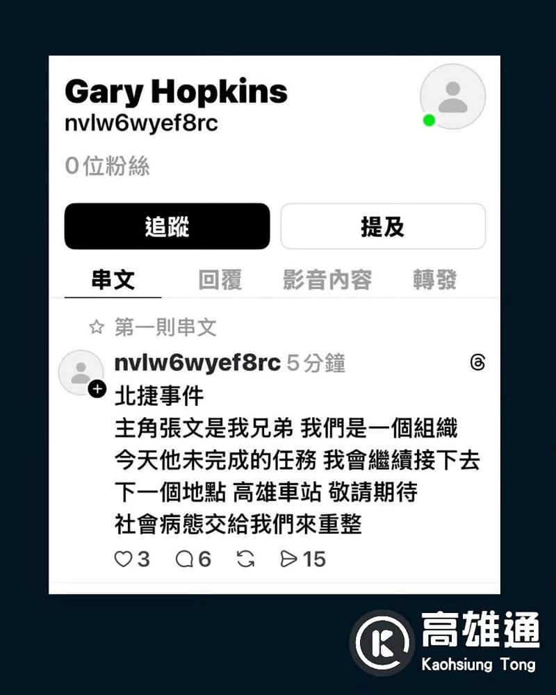 台北車站日前發生隨機殺人事件後,有網友在Threads貼文指 「主角張文是我兄弟,我們是一個組織,他未完成的任務,會繼續接下去,下一個地點是高雄車站,敬請期待」,貼文被網友截圖引發社會高度恐慌,橋頭地檢署接獲情資後立即展開偵辦,於20日搜索並拘提1名陳姓男大學生到案,訊後認其涉嫌恐嚇公眾安全罪嫌重大,諭知以新台幣5萬元交保。