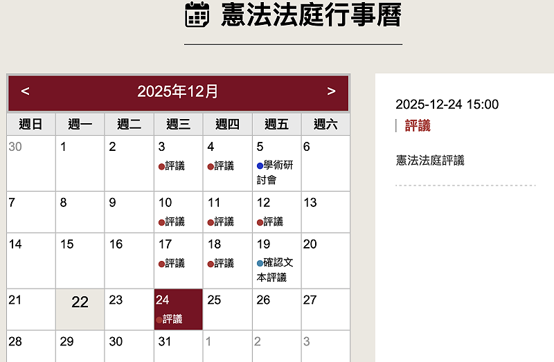 不過,憲法法庭今日則在行事曆公布新的「評議」時程,將於24日進行評議。而大法官至少2/3門檻評議規定,並不在上週判決違憲範圍,也就是現行大法官如果要認定24日評議有效,在3名大法官拒審下,恐怕需再重演一次把他人「迴避」戲碼。