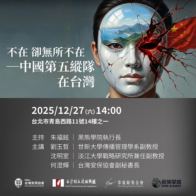 近年來,越來越多研究顯示,中國對台灣的威脅,並不僅止於軍事層面,而是長期透過「第五縱隊」的方式,從內部削弱台灣社會的抵抗意志與民主韌性。對此,台灣安保協會、台灣獨立建國聯盟、辜寬敏基金會、黑熊學院等民團將於本週六(12/27)14時在台灣獨立建國聯盟辦公室舉辦「不在 卻無所不在 ─ 中國第五縱隊在台灣」講座,並邀集世新大學傳播管理學系副教授劉玉皙、淡江大學戰略研究所兼任副教授沈明室、以及台灣安保協會副秘書長何澄輝分享第五縱隊對台灣影響。