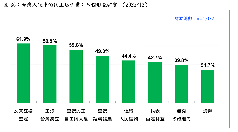 此外,他也有四個不受多數台灣人肯定的特質,包括:不值得人民信賴、不代表一般老百姓利益、不是最有執政能力、不是清廉的政黨。