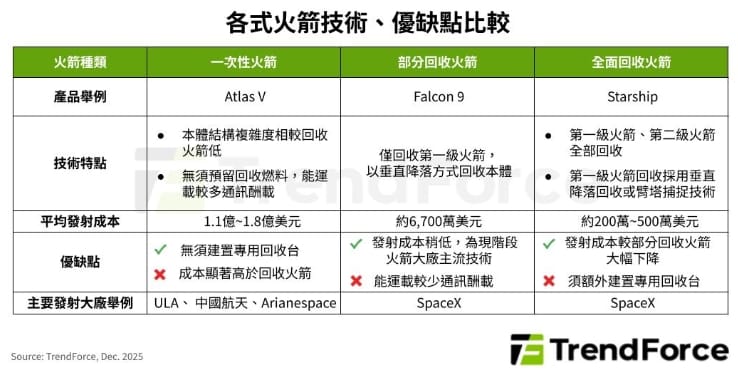 TrendForce表示,目前一次性火箭的平均發射成本落在1.1億至1.8億美元,部分回收則是6,700萬美元左右。全球主要大廠積極發展可回收技術,目標在達成全面回收的情況下,將發射成本降低至200萬至500萬美元。
