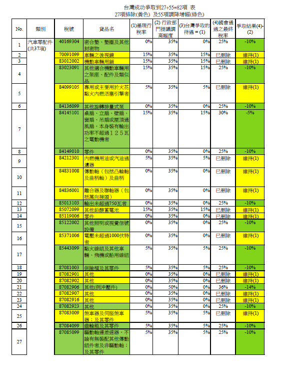 經貿辦進一步說明,82項貨品中,維持現有稅率者27項,包括:汽車零組件(後視鏡等21項)、塑膠製品(3項)、鋼品(3項)。調低增幅者55項,包括:汽車零組件(齒輪箱等16項)、化纖、樹酯、PVC及人造皮(31項)、紙板及標籤(5項)、化妝品及原料(2項) 及摩托車 (1項)。