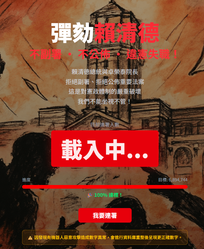針對行政院長卓榮泰宣布不副署《財政收支劃分法》,國民黨與民眾黨立法院黨團 19 日正式宣布提案彈劾總統賴清德。同時,網路上也出現「彈劾賴清德」連署平台,截至 20 日下午,連署人數已突破 600 萬人,超過賴清德在 2024 年總統大選所獲得的 558 萬票;截至今(23)日甚至超越前總統蔡英文 2020 總統大選時的得票數 817 萬。