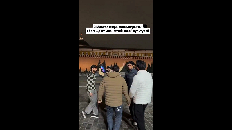 網路流傳的影片顯示,在莫斯科紅場,來自印度的移民播放印度音樂、載歌載舞,以自身文化吸引不少俄羅斯民眾注意。 圖:翻攝自影片