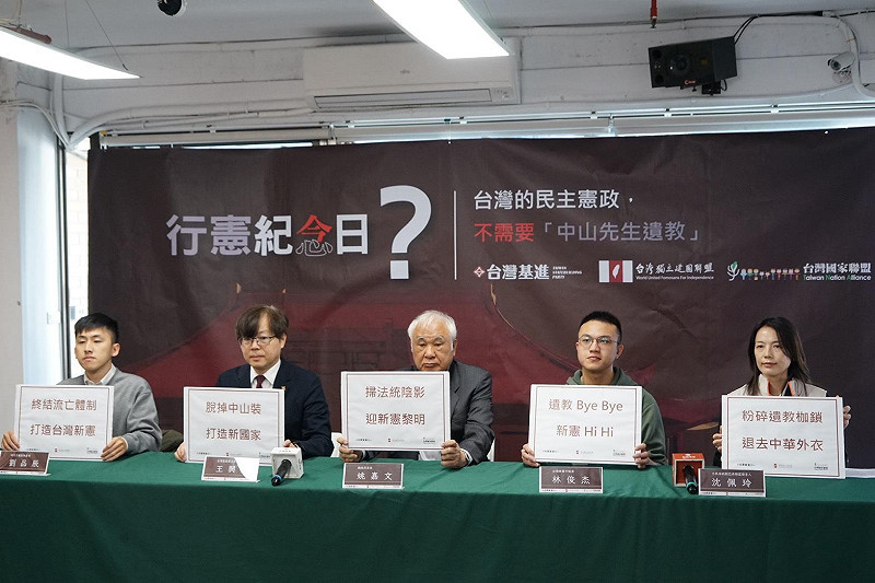 「行憲紀念日」前夕,由台灣基進、時代力量、台灣綠黨及小民參政歐巴桑聯盟組成的「台灣前進」今(24)日共同召開記者會,強調台灣的憲政民主實踐與主權獨立,不應再以「中山先生遺教」作為法統基礎,呼籲終結流亡體制、推動屬於台灣的新憲法,並高喊「終結流亡體制,打造台灣新憲」、「脫掉中山裝,打造新國家」、「掃法統陰影,迎新憲黎明」、「遺教ByeBye,新憲HiHi」等口號。
