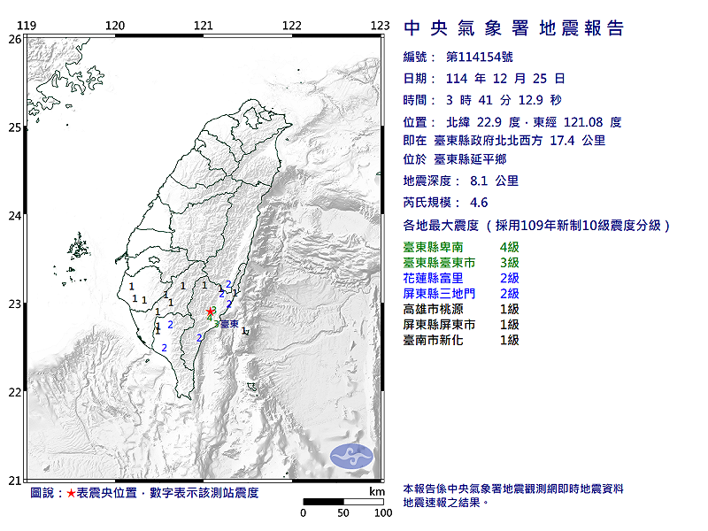 根據中央氣象署資料,12/25-03:41發生芮氏規模4.6有感地震 ,震央位於北緯 22.9度、東經121.08度,地震深度為8.1公里 ,相對位置在臺東縣政府北北西方 17.4 公里 (位於臺東縣延平鄉)。各地最大地震度級: