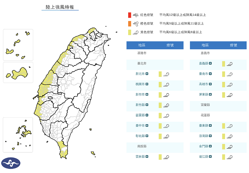 由於東北風增強,台南以北、桃園、基隆北海岸、恆春半島及各離島,今日極易發生平均風6級以上或陣風8級以上的強風。同時基隆北海岸、東半部沿海及恆春半島皆有長浪發生機率,請民眾避免前往海邊活動以策安全。