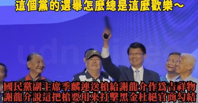 國民黨24日通過徵召黨籍立委謝龍介參選台南市長,國民黨副主席季麟連25日在台南市感恩餐會造勢,親自送上「手槍」給謝龍介,預祝謝龍介旗開得勝,火力全開,還當場組裝好,要謝龍介「開一槍」,謝也將槍舉高響應。對此,林智群律師直呼,台南要變成慶記之都了嗎?資深媒體人周玉蔻怒轟,是多沒人性、多仇恨的政黨,才會用開槍為選舉造勢?