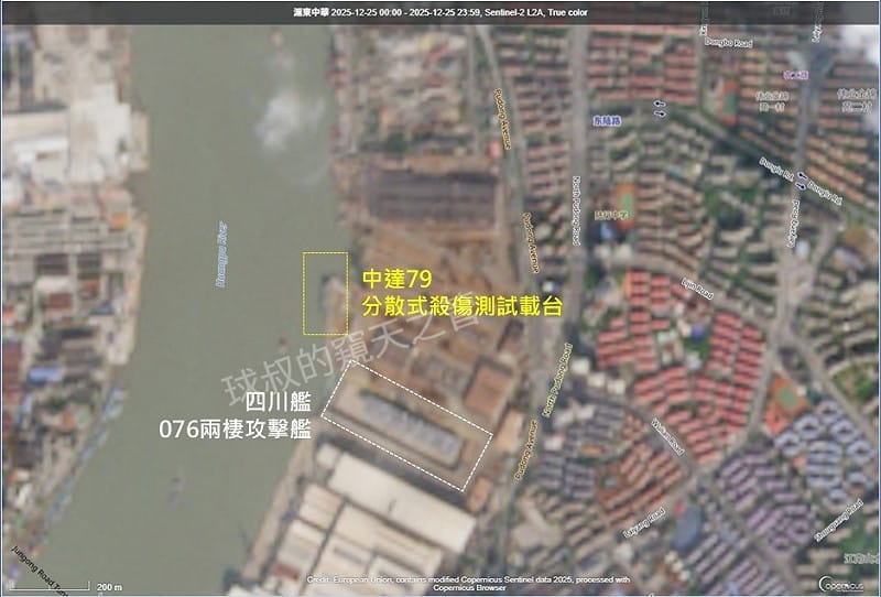 軍事專家呂禮詩今天(26日)以「聖誕節驚嚇」形容從衛星圖片上發現的新訊息。該圖片顯示,中國海軍076型兩棲攻擊艦首艦「四川艦(舷號51)」在上海滬東中華造船廠船塢,而模組化分散式殺傷測試載台「中達79」就現身在附近碼頭。呂禮詩直言,這對美軍而言,與去年解放軍殲-36和殲-50試飛應該算「同一等級的聖誕節驚嚇」。凸顯中國海軍在兩棲與無人作戰領域的快速進展,甚至早一步實現「平戰一體、高低搭配、數量+隱蔽」建軍思路。