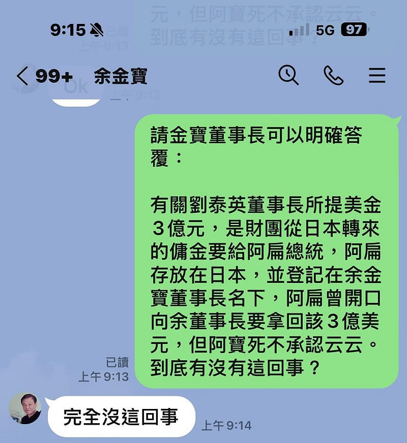 對於該說法,陳水扁公開今天早上與余金寶透過通訊軟體聯繫的對話截圖,陳水扁詢問:「有關劉泰英董事長所提美金3億元,是財團從日本轉來的傭金要給阿扁總統,阿扁存放在日本,並登記在余金寶董事長名下,阿扁曾開口向余董事長要拿回該3億美元,但阿寶死不承認云云。到底有沒有這回事?」 余金寶則回覆:「完全沒這回事」。