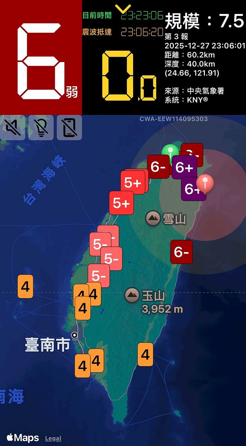 台灣27日深夜23時06分左右發生規模7.0強烈地震。 圖:翻攝自中央氣象署