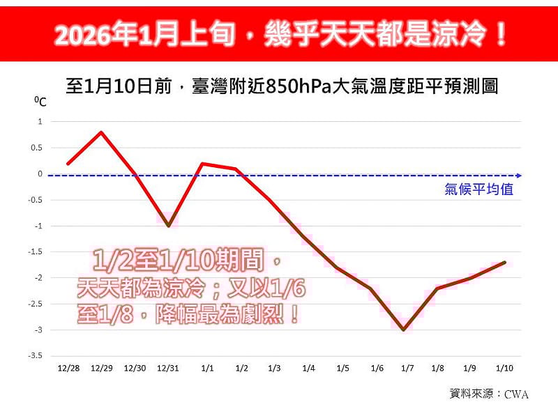 他表示,明年1月1日白天起,氣溫雖會逐步、緩慢回升,但回溫幅度相當有限;到了1月2日下半天後,氣溫又將再度轉為下滑趨勢,接下來一直到1月10日,若與氣候平均值相比,逐日氣溫皆偏低。