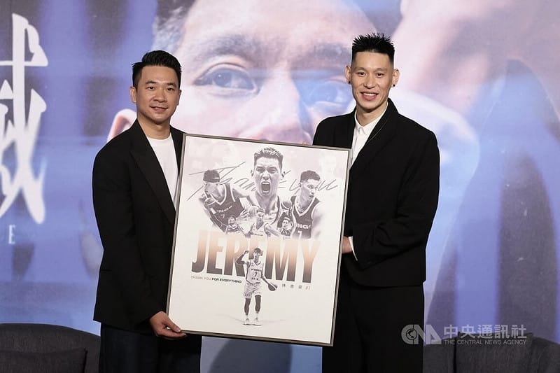 籃球球星林書豪(右)28日在退休4個月後舉行球迷感謝會,除了收下PLG副會長陳建州(左)所送的退休禮外,也提到自己和兒子關係大躍進。中央社記者吳家昇攝 114年12月28日
