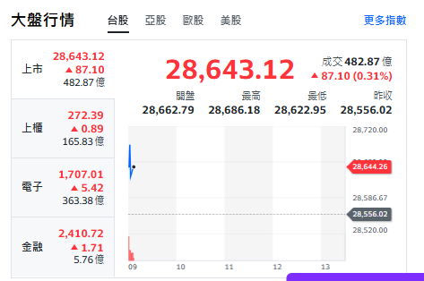 台股今天(29日)開紅小衝87點,最高來到28686點。上櫃、電子與金融類股全揚升。重要電子權值股,約9點20分前,台積電漲5元、來到1515元。廣達跌1元、來到262元。鴻海漲4元、來到229.5元。台達電漲12元、來到968元。聯發科漲5元、來到1390元。