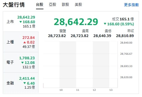 台股今天(30日)開黑跌逾百點,最低來到28640點。上櫃揚升電子與金融類股下挫。重要電子權值股,約9點10分前,台積電跌15元、來到1515元。鴻海跌1.5元、來到229.5元。台達電漲3元、來到965元。廣達跌1.5元、來到261.5元。聯發科跌15元、來到1405元。