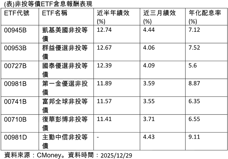 近年來,配息多屬於海外所得的債券ETF,逐漸受到市場青睞,特別是債息相對高的非投資等級債ETF,自然成為愛息族的首選。連同今年九月才成立的主動中信非投等債(00981D),目前在台股掛牌的非投等債ETF共有 7 檔,其中近半年、近 3 個月含息總報酬率都擒得桂冠的是凱基美國非投等債(00945B)。