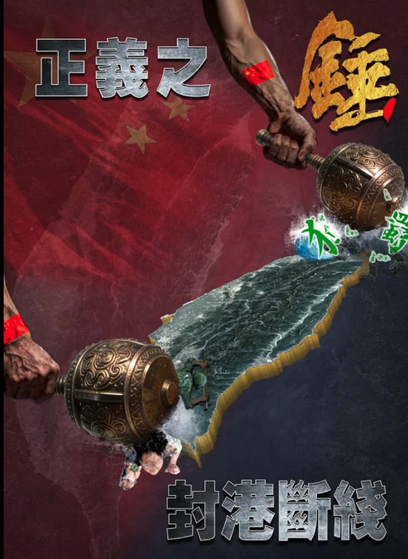 今日上午,解放軍東部戰區又發布名為《正義之鎚 封港斷線》視覺主體海報,並以中英文搭配表示:「重拳出擊,真打實封,鎚頭斷尾,牽手回家若不歸,出手重擊莫後悔。」從海報視覺設計來看,圖中有兩把錘子重擊位於台灣北部「獨」字,以及南部手持民進黨黨徽的政要及軍人,震攝所謂台獨和民進黨政府意味濃厚。
