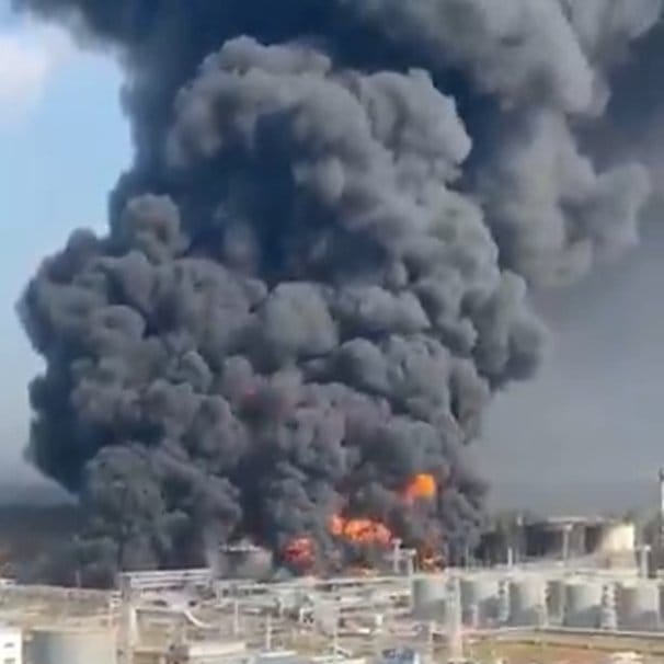 25日,烏克蘭無人機精準擊中俄羅斯諾沃沙赫京斯基煉油廠,引發猛烈爆炸與大火,導致該廠徹底停擺。 圖:翻攝自 X @Daractenus