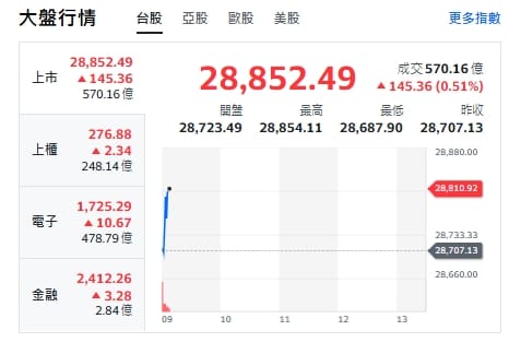 台股今天(31日)開紅衝漲逾140點,最高來到28854。重要電子權值股,約9點20分前,台積電漲5元、來到1525元。鴻海漲2.5元、來到230.5元。廣達漲1.5元、來到264.5元。台達電維持平盤、來到961元。聯發科維持平盤、來到1420元。