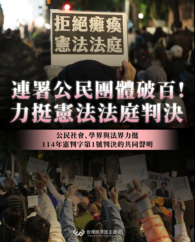 由於藍白兩黨不滿 114 憲判字 1 號宣告《憲訴法》修法無效,在立法院提案要求「114 年憲判字第 1 號判決無效」,逕付二讀引發爭議。經民連與公民團體、學界、律師發起聯署聲明力挺判決,至昨(30)日晚已有 100 團體加入。台灣青年民主協會理事長楊姿潁指出,民主政治須以憲法為最高標準,而憲法法庭是保障人民與青年權利的最後防線。